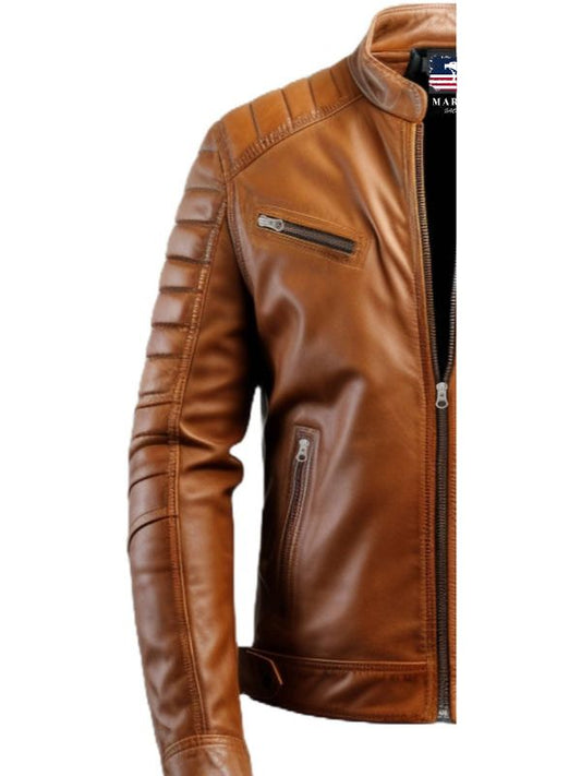 Men Tan Leather Biker Jacket - Leather Jacket for Men