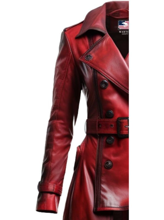Women Distressed Red Leather Long Coat - Distressed Leather Coat