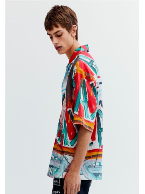 Check out this Sherri 2025 Jawn Murray Printed Camp Shirt for your beach-y or vacation days. The shirt is made of premium polyester material and has a Cuban-style collar. It has a front buttoned closure, short sleeves with open hem cuffs, and one chest pocket. The shirt is multicolored and has a printed style.