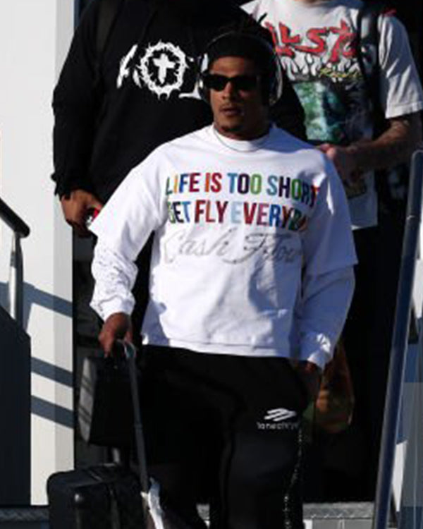 Isiah Pacheco, a football running back for the Kansas City Chiefs of the NFL, was spotted at the Super Bowl LIX 2025, and we love how lively he looks, doesnƒ??t he? This Super Bowl LIX 2025 Isiah Pacheco White Printed T-Shirt is fabricated from cotton, that makes it soft and lightweight. It features a round style collar paired up with pull-on closure for convenient wear, with short sleeves that end up with open hem cuffs. The white T-shirt features multi-colored text print that says LIFE IS TOO SHORT GET FLY EVERYDAY.