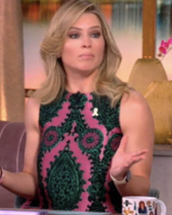 Have a look at The View 2025 Sara Haines Pink Printed Feather Trim Top ƒ?? isnƒ??t this chic? This top feature a unique and catchy design that makes it just the perfect piece to grab onto! The top is fabricated from satin, that makes it soft and lightweight. It is further lined with viscose fabric lining that brings out comfort and breathability as well. The scoop neckline comes down to a pull-on closure with zipper at the back, along with sleeveless sleeves and open hem cuffs. The pink printed top features fur trim at the hem.