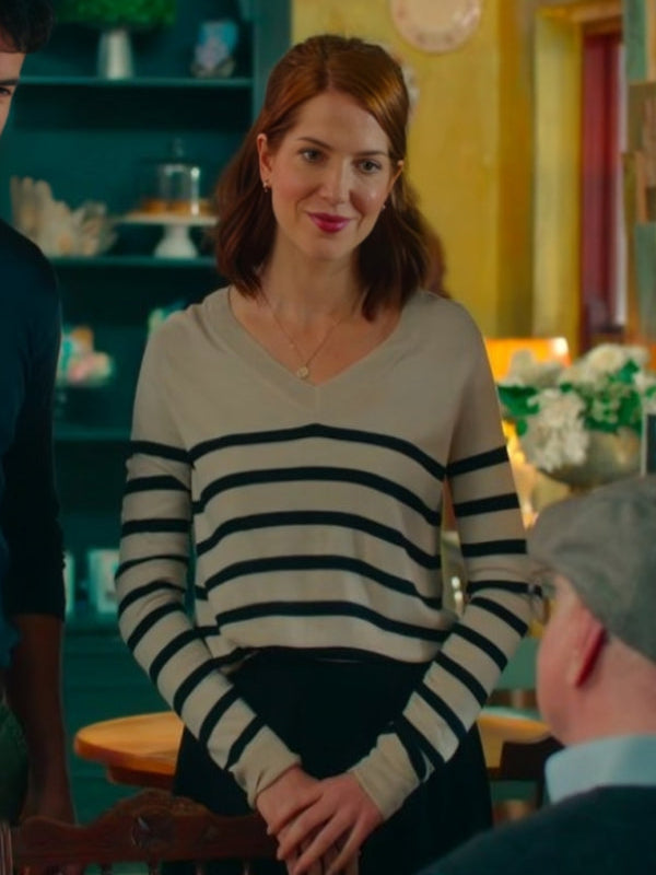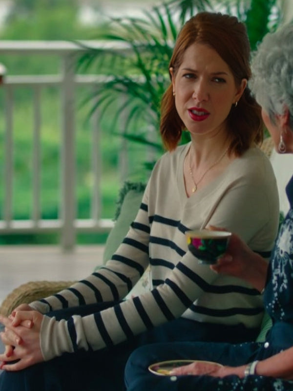 Description Tuiskoms 2025 Amalia Uys Grey Pinstripe Sweater Tuiskoms, meaning in English Homecoming,® is a drama television series that premiered on February 28, 2025, in South Africa. The story tells the tale of Fleur, who returns to her hometown with her daughter after a series of misfortunes to renew her life. Amalia Uys plays the character Fleur and looks stylish in this Tuiskoms 2025 Amalia Uys Grey Pinstripe Sweater that she wore in the series. Hurry up! Grab your sweater before its gone. This stylish womens sweater is made from high-quality knitted material. It is finely designed with a collarless ribbed V-neck and long sleeves with rib-knitted cuffs. It is a pullover sweater with a ribbed hem. This womens soft and cozy sweater is available in grey with black stripes.