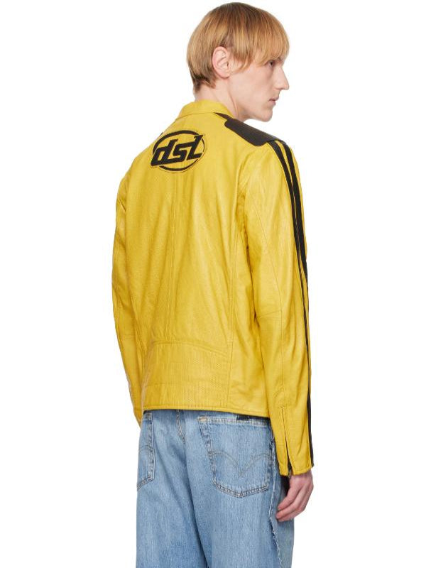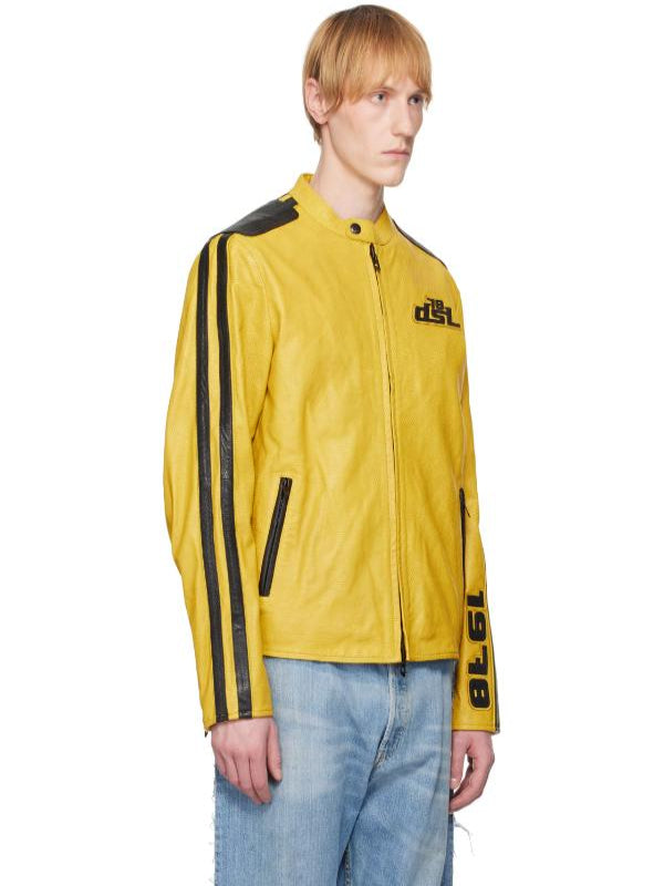 External Material: Real Leather Material Internal Material: Soft Viscose Lining Collar: Snap-Tab Collar Closure: Zipper Closure Sleeves: Long Cuffs: Open Hem Cuffs Pockets: Two Front Pockets, Two Inner Pockets Color: Yellow