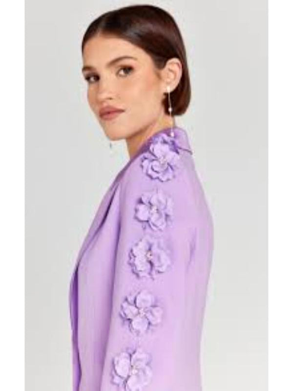 External Material: Wool Blend Internal Material: Soft Viscose Lining Collar: Lapel Style Collar Closure: Open Style With Buttoned Closure Sleeves: Long With Floral Appliques Sleeves Cuffs: Open Hem Cuffs Pockets: Two Front Waist Pockets, Two Inner Pockets Color: Lilac